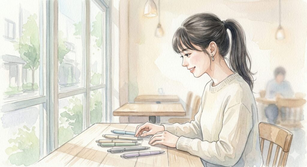 そして素晴らしいのが、このライトタッチインク搭載モデルの「軸色」です。かつてのパキッとした原色系やメタリックなビジネスカラーとは異なり、ライトブルー、シェルホワイト、セージといった、生活に調和するニュアンスカラーが意図的に採用されています。インクの持つ「かろやかさ」という物理的な特性を、視覚的にも表現した高度なプロダクトデザインですよね。生活空間にスッと溶け込むこの新しい歴代モデルは、まさに現代の私たちのために作られた究極のリラックスツールかなと思います。
