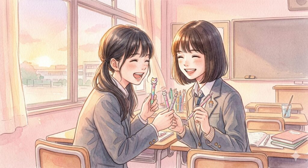 この若者向けモデルのすごいところは、外見はポップで可愛いのに、中身は大人たちが使っているのと同じ、あの「最高になめらかなインク」がしっかり搭載されていることです。安価なキャラクターペンは書き味がイマイチ……という当時の常識を打ち破り、「可愛くて、しかもめちゃくちゃ書きやすい!」という強烈な口コミを学生たちの間に生み出しました。