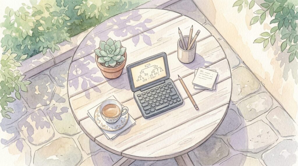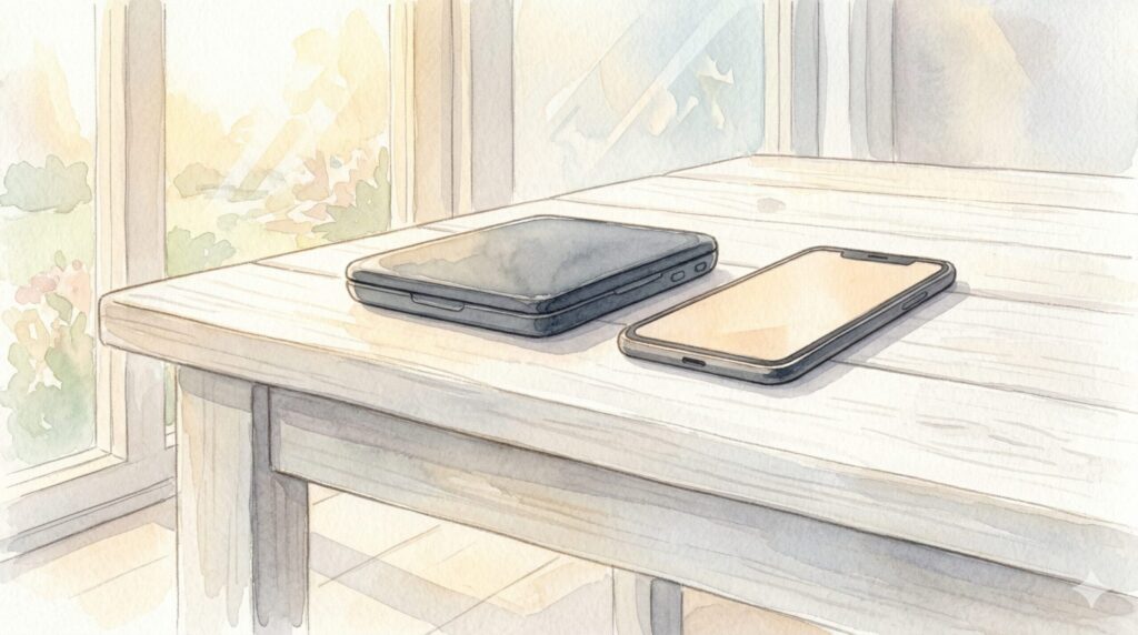 もちろん、ブログ執筆や小説の設定考証において「調べ物」がゼロになるわけではありません。そこでプロは、ポメラにネットがないことを逆手に取り、「調べ物は手元のスマホで行う」という役割分担を徹底しています。スマホで情報を検索し、その画面を開きっぱなしにして参照しながら、ポメラのキーボードでテキストを打ち込むスタイルです。これにより、執筆のメイン画面(ポメラ)には常に自分のテキストだけが表示され続けるので、ブラウザのタブを切り替えるたびに執筆の文脈を見失うという認知的エラーを完全に防ぐことができるんですよ。これ、極めて高度なライフハックです!