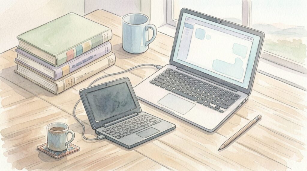 つまり、ポメラはあくまで「ローカルで完結する最強の執筆環境」として定義するんです。データの転送は、数時間に及ぶ集中した執筆作業が終わった後や、1日の終わりの区切りのタイミングでまとめて行う「バッチ処理」として扱うのが一番おすすめかなと思います。この十数秒の待機時間も、「今日もたくさん書いたな」と振り返るためのクールダウンの儀式だと思えば、全く苦になりませんよ。むしろ、頻繁に通信を行わないからこそ、あの驚異的なロングバッテリーが実現できているんです。
