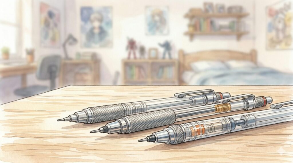 最近は、削る手間が一切ない特殊合金芯を使った「メタルペンシル(メタシルなど)」という新しいジャンルも登場して定着しつつあります。鉛筆特有の削りカスが出ず、消しゴムで消すこともできるので、美術のデッサンや下書き、あるいはマークシートを素早く塗る予行練習など、特定の場面ですごく役立つんですよ。
